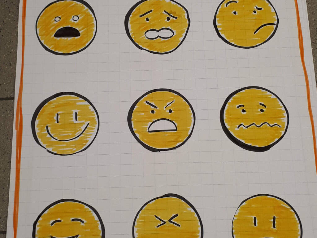 Bereitet zum Beispiel ein Flipchart mit Gesichtern, die Emotionen ausdrücken, vor, zum Beispiel: